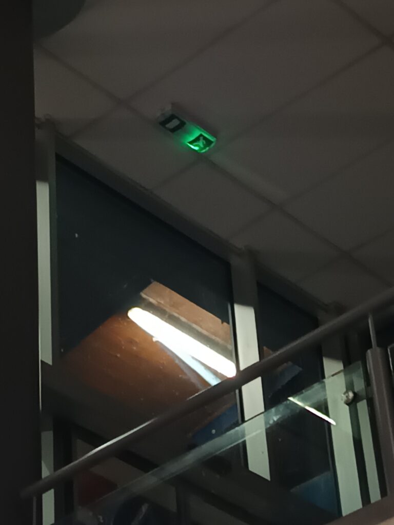 Při úniku lehejte na záda a sledujte cedule na stropě. Poté se zvedněte a pokyny následujte.